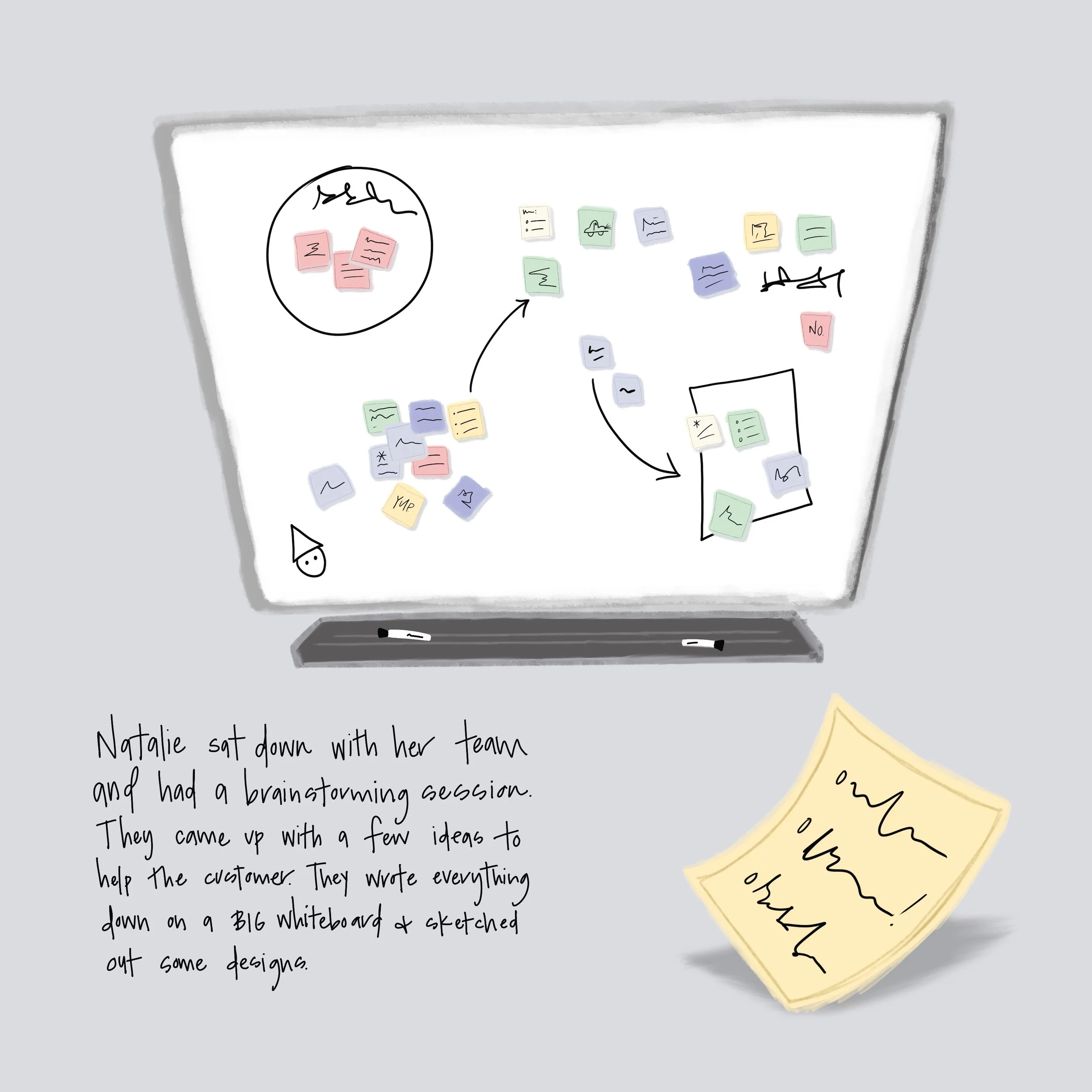 Natalie sat down with her team and had a brainstorming session. They came up with a few ideas to help the customer. They wrote everything down on a BIG whiteboard and sketched out some designs.