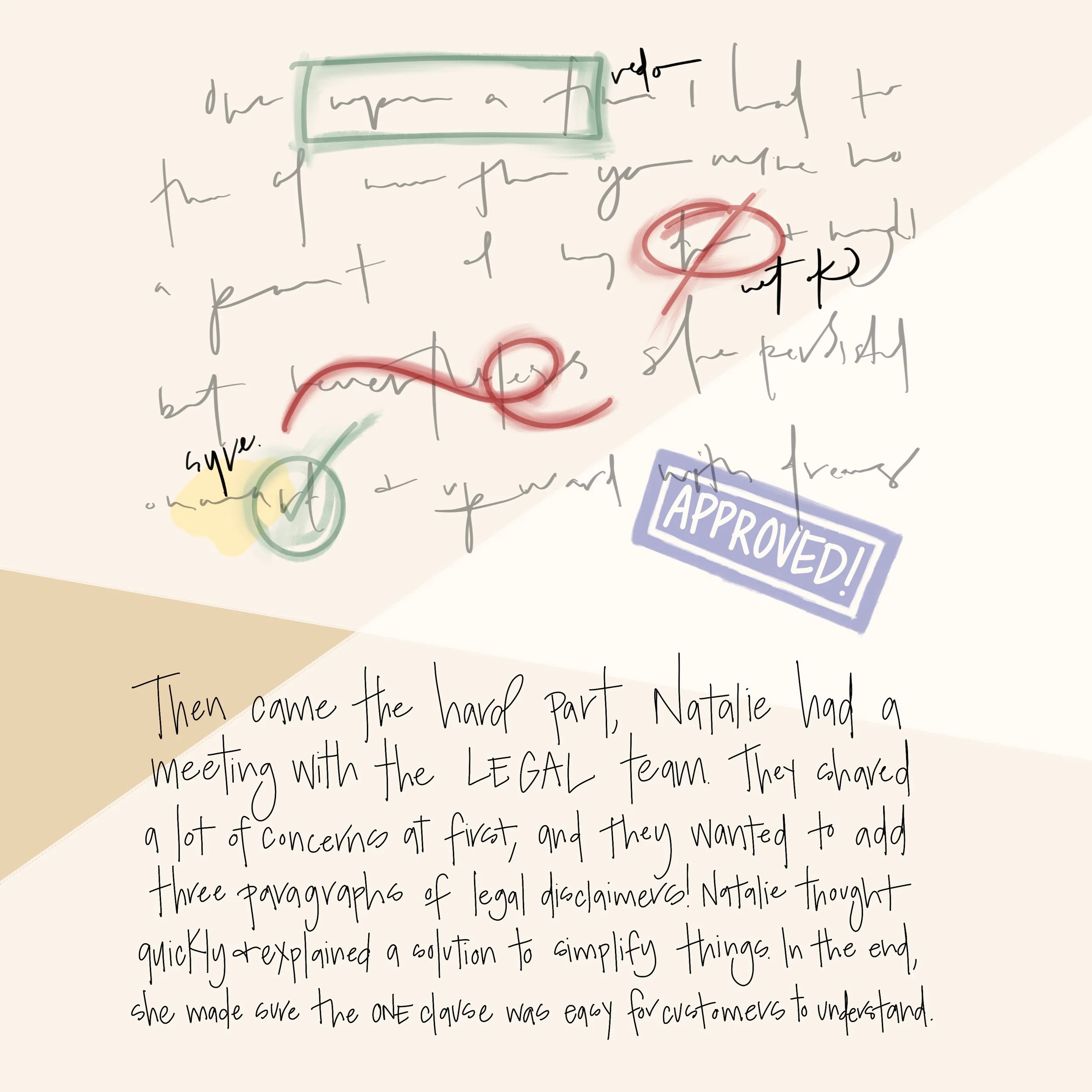 Then came the hard part, Natalie had a meeting with the LEGAL team. They shared a lot of concerns at first and they wanted to add three paragraphs of legal disclaimers! Natalie thought quickly and explained a solution to simplify things. In the end, she made sure the one legal clause was easy to understand for the customers.