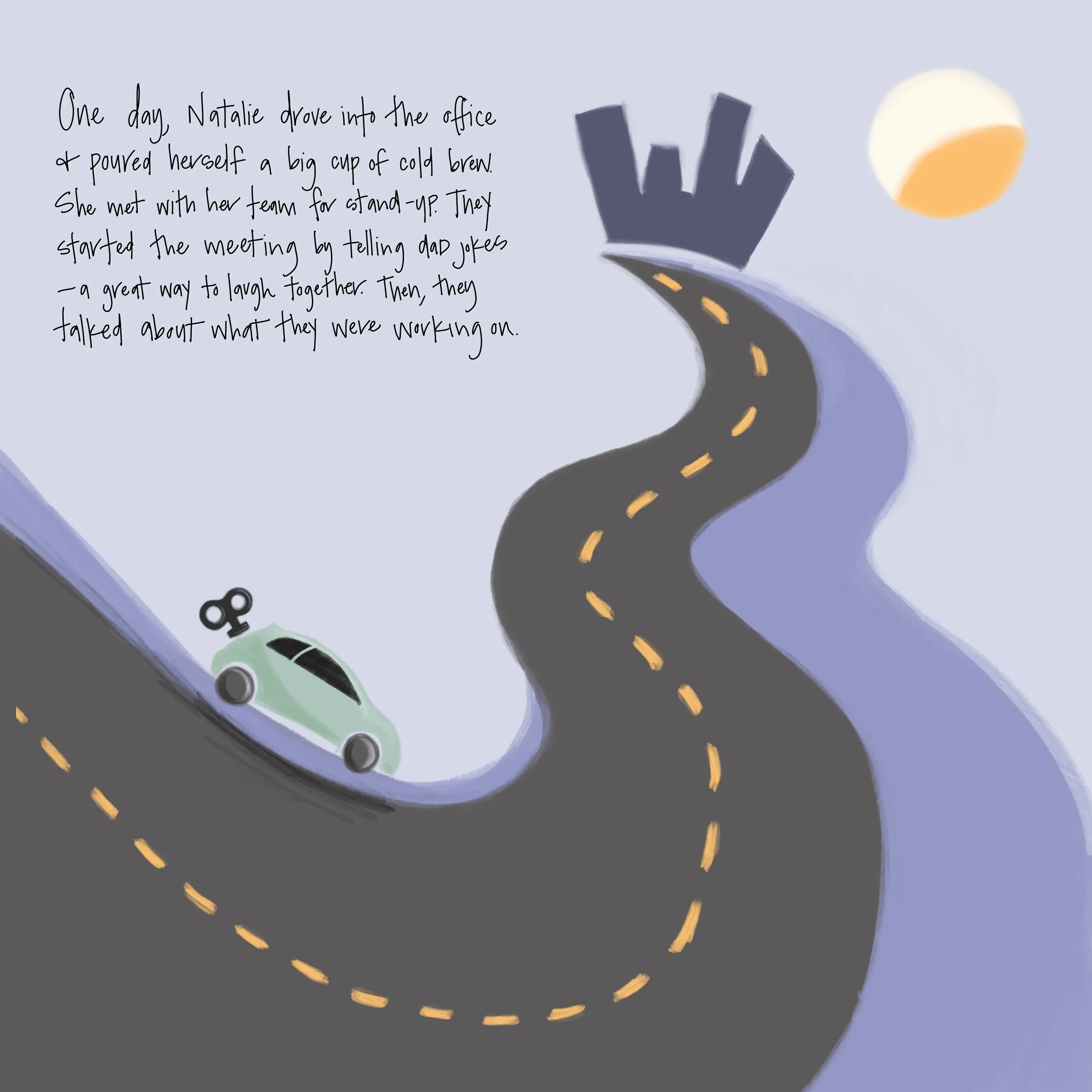 One day, Natalie drove into the office and poured herself a big cup of cold brew. She met with her team for stand-up. They started the meeting by telling dad jokes - a great way to laugh together. Then, they talked about what they were working on.