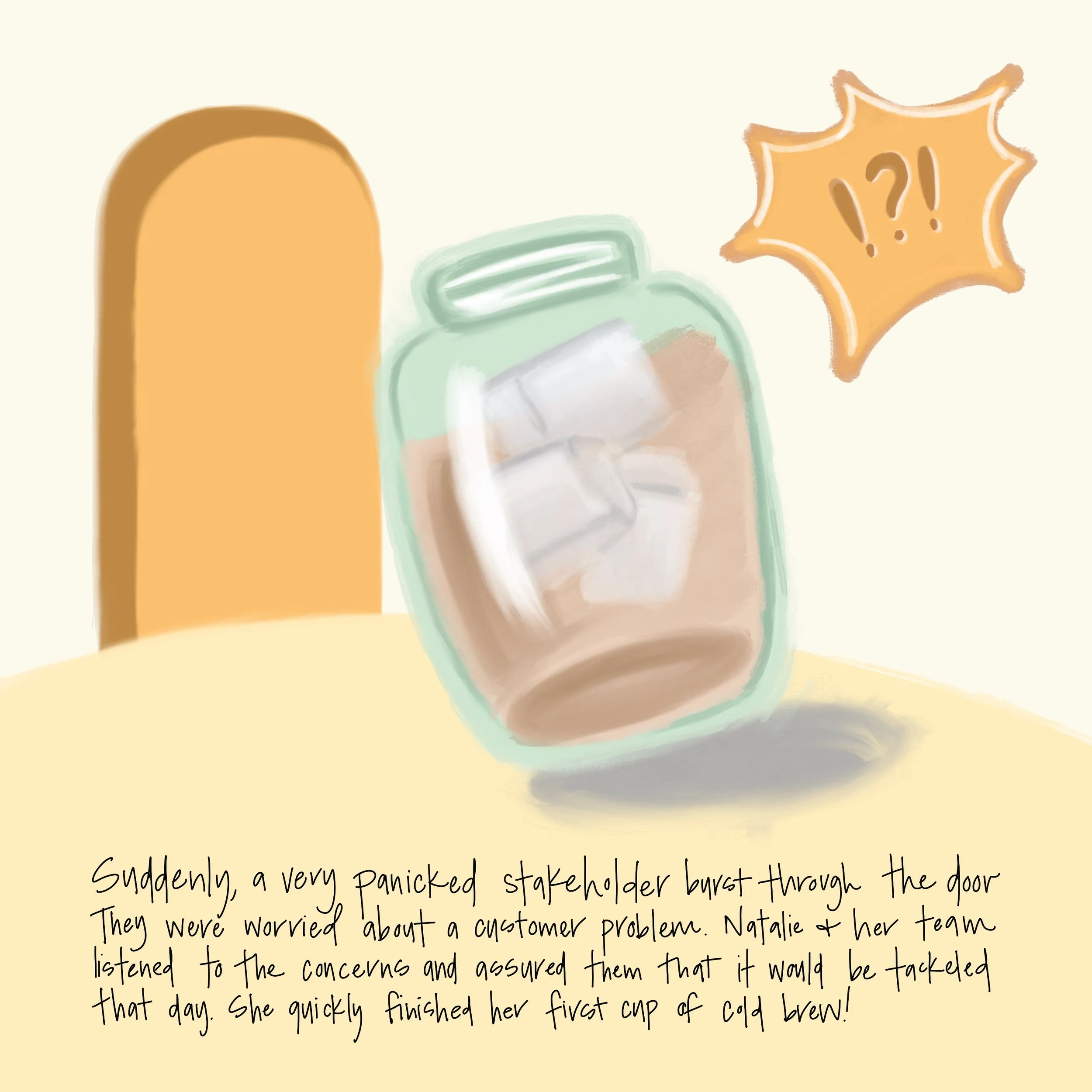 Suddenly, a very panicked stakeholder burst through the door. They were worried about a customer problem. Natalie & her team listened to the concerns and assured them that it would be tackled that day. She quickly finished her first cup of cold brew!