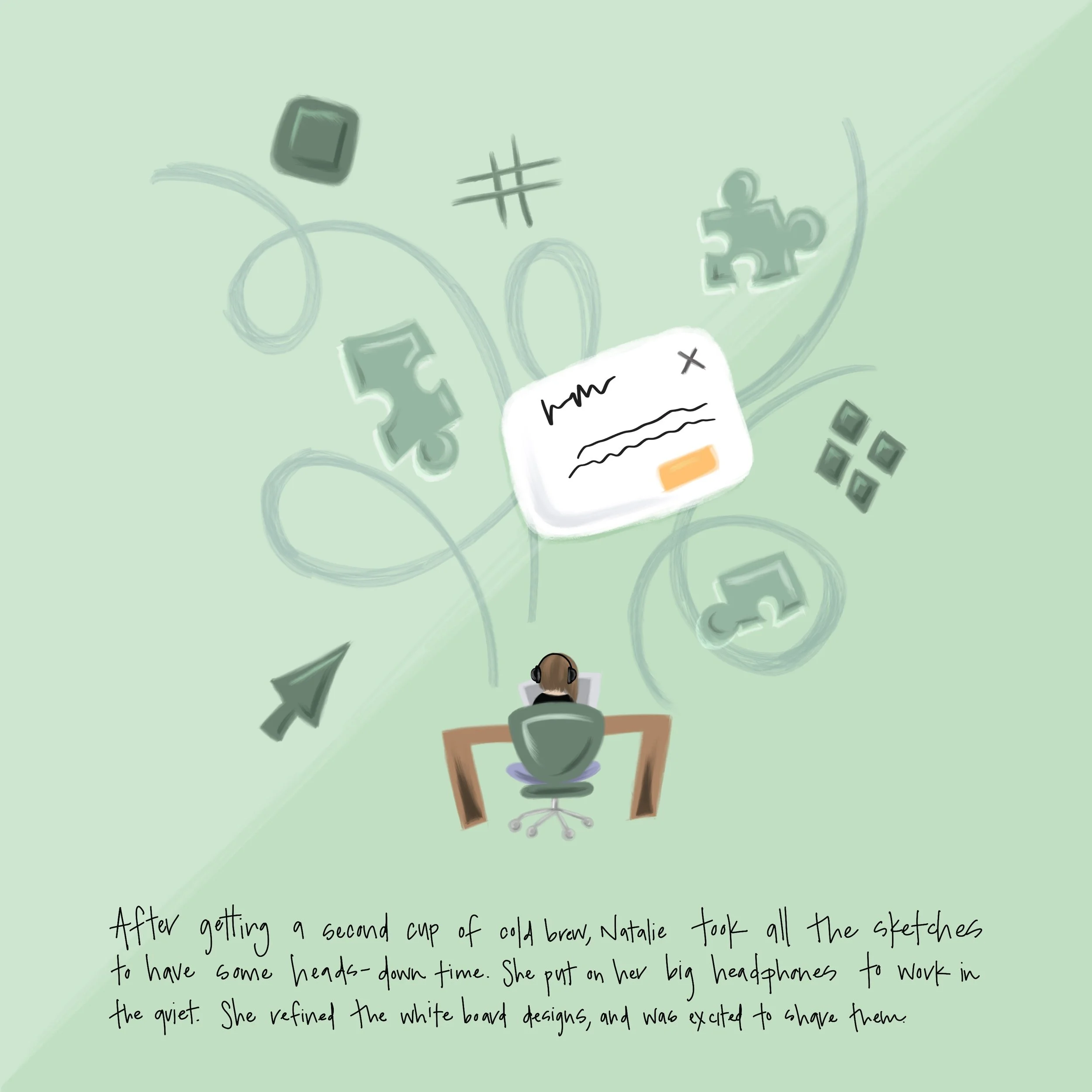 After getting a second cup of cold brew, Natalie took all the sketches to have some heads-down time. She put on her big headphones wot work in the quiet. She refined the white board designs and was excited to share them.